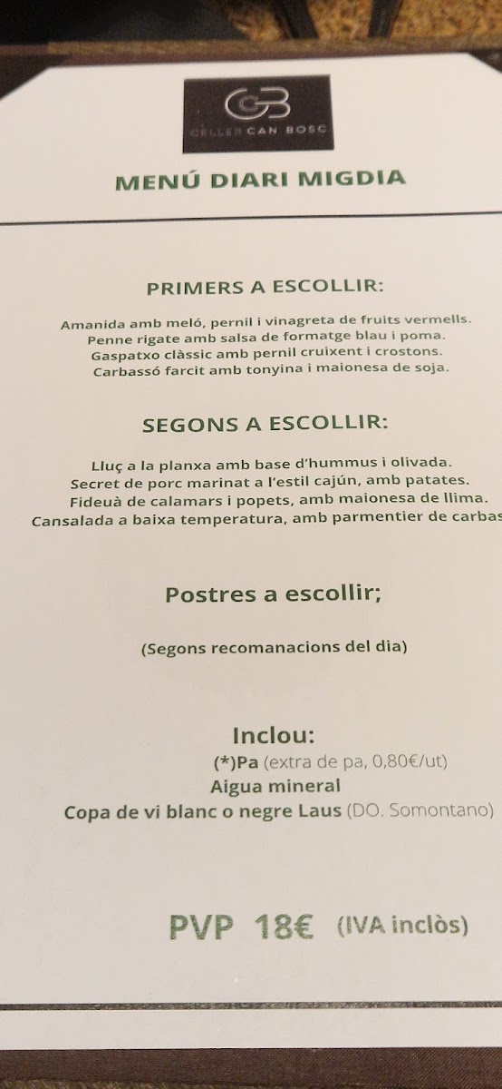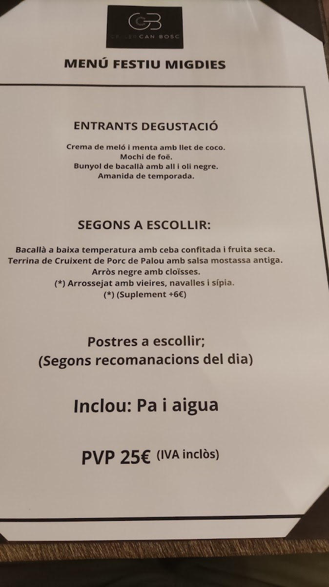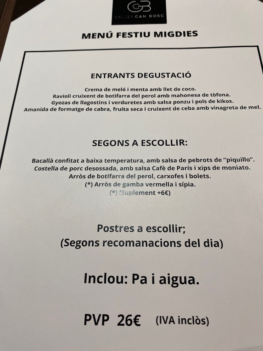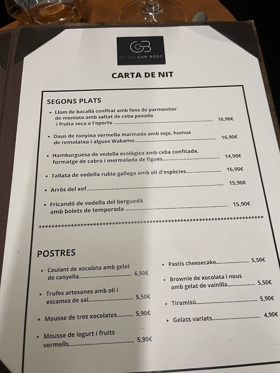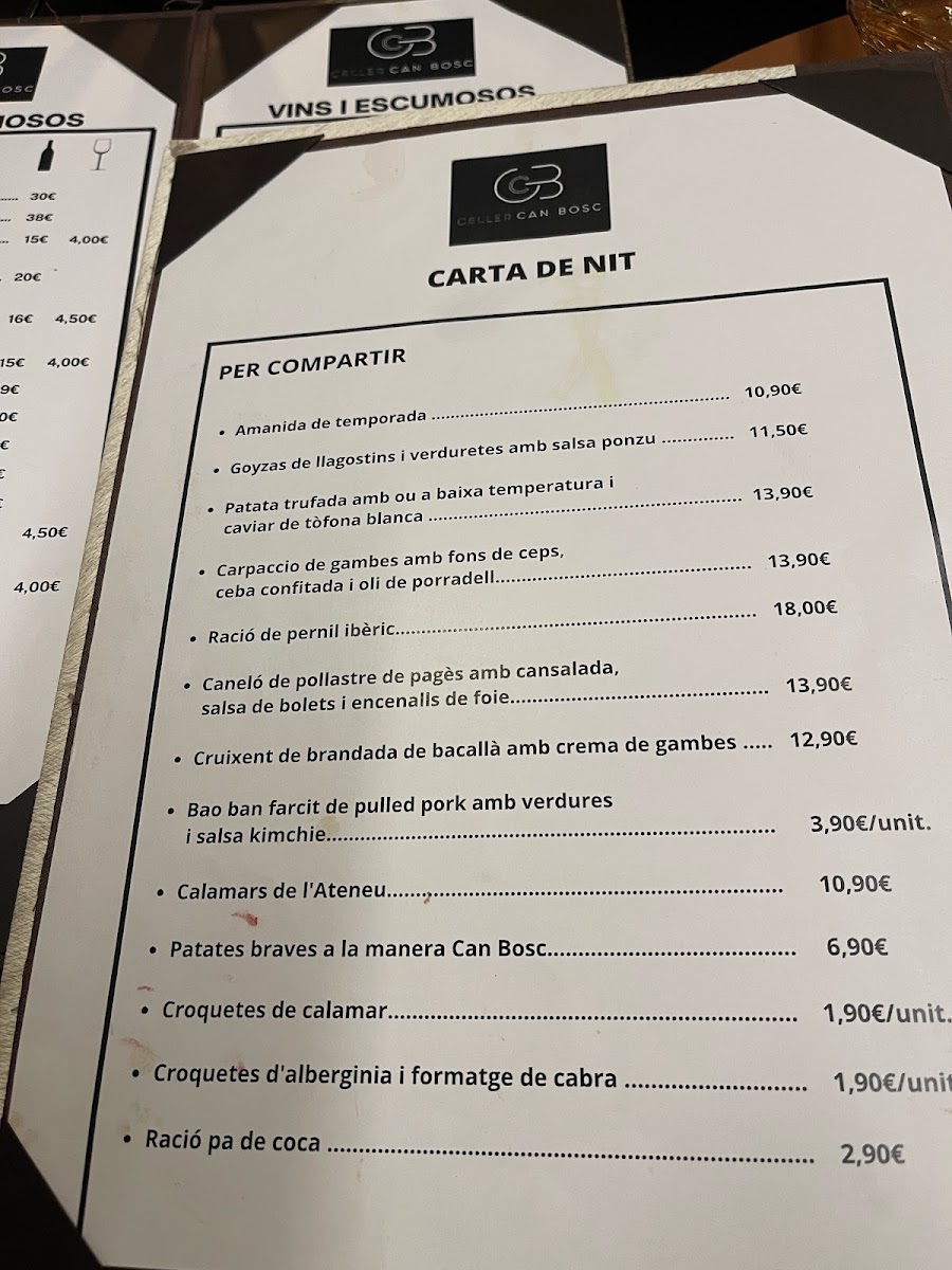 Celler Can Bosc offers a menu that highlights a perfect balance of traditional Catalan flavors with a modern twist. The dishes showcase high-quality ingredients and inventive preparation. For starters, the Daus De Tonyina Vermella (red tuna cubes) and Carpaccio De Gambes (shrimp carpaccio) provide a refreshing and delicate introduction to the meal, with each bite offering a clean, flavorful experience. The main courses continue this trend with options like the Pulled Pork, tender and rich, offering a comforting, melt-in-your-mouth texture. Additionally, the Cruixent de Porc (crispy pork) stands out for its crispy exterior and succulent meat, perfectly seasoned for an indulgent savory bite. For dessert, the Pastís de Formatge (cheesecake) is an excellent conclusion to the meal, creamy and smooth, while the Crema de Melo I Menta Amb Llet de Coco (melon and mint cream with coconut milk) delivers a light, refreshing finish. Overall, the menu at Celler Can Bosc is a well-curated journey of textures and flavors, combining both innovative and familiar elements for an unforgettable dining experience.